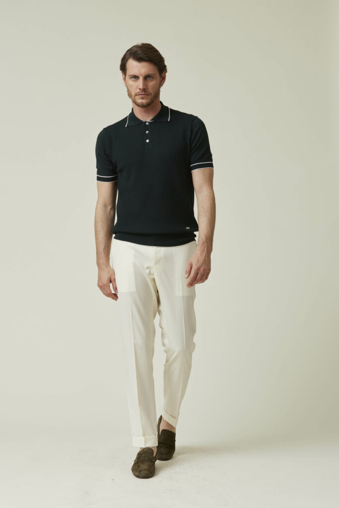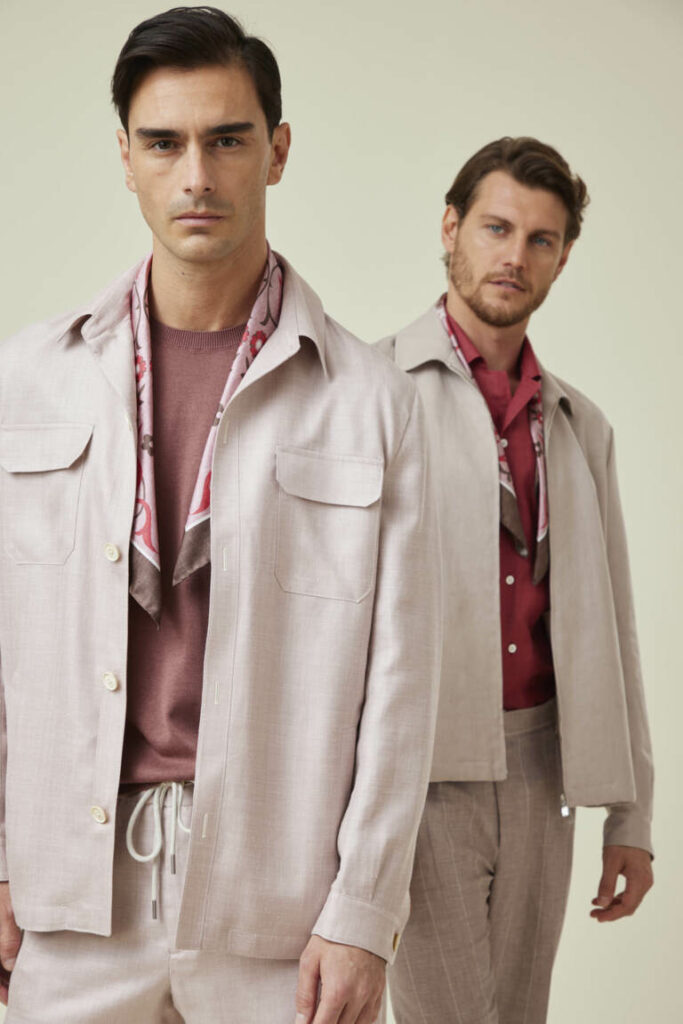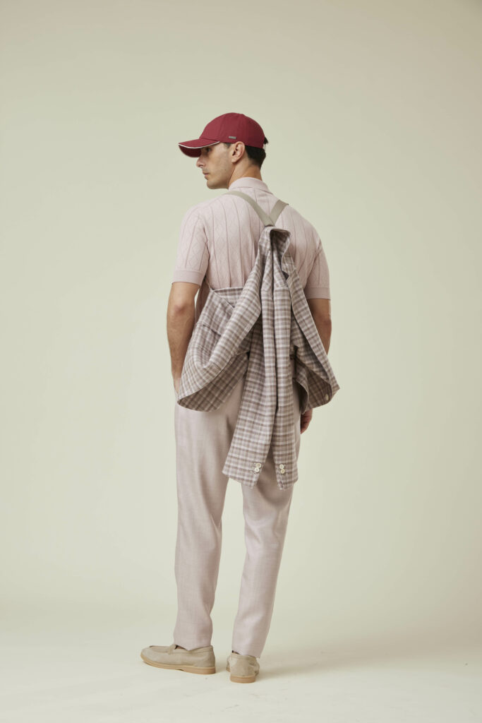 La collezione include anche t-shirt e polo in filo di Scozia e seta, camicie a maniche corte dalla costruzione impeccabile e pantaloni con zip invisibili e coulisse regolabili, studiati per garantire comfort, libertà di movimento e versatilità.