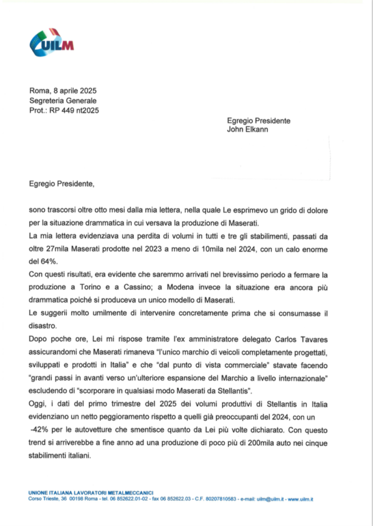 “Sono trascorsi oltre otto mesi dalla mia lettera, nella quale Le esprimevo un grido di dolore per la situazione drammatica in cui versava la produzione di Maserati – scrive il leader Uilm – siamo passati da oltre 27mila auto prodotte nel 2023 a meno di 10mila nel 2024, con un calo enorme del 64%”.