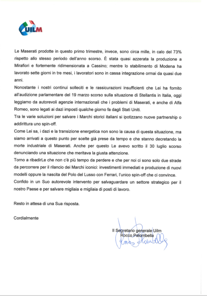 “Nella sua risposta – continua Palombella – Lei, tramite l’ex amministratore delegato Carlos Tavares, mi assicurò che Maserati rimaneva “l’unico marchio di veicoli completamente progettati, sviluppati e prodotti in Italia” e che “dal punto di vista commerciale” stavate facendo “grandi passi in avanti verso un’ulteriore espansione del Marchio a livello internazionale” escludendo di “scorporare in qualsiasi modo Maserati da Stellantis”.