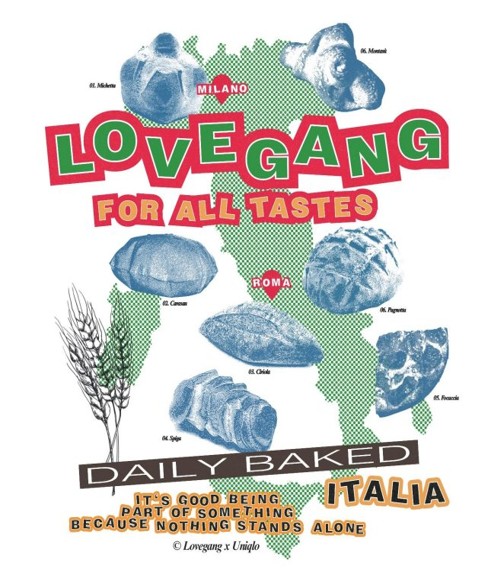 UNIQLO rinnova la collaborazione con il collettivo romano Lovegang per il progetto UTme!, con una collezione di T-shirt in edizione limitata disponibile nei flagship store di Roma e Milano. La partnership, inserita nel servizio di personalizzazione UTme!, sviluppa grafiche originali ispirate ai temi dell’identità e della cultura del cibo, con il concept del “pane quotidiano” come metafora della vita quotidiana e dei rituali condivisi. Le T-shirt trasformano elementi della cultura italiana in linguaggio visivo pop, in linea con la filosofia UNIQLO di capi essenziali e universali. Il lancio è accompagnato da un evento alla community presso Forno Campo de’ Fiori a Roma, con DJ set e momenti di incontro, rafforzando il legame tra brand, città e creatività locale.