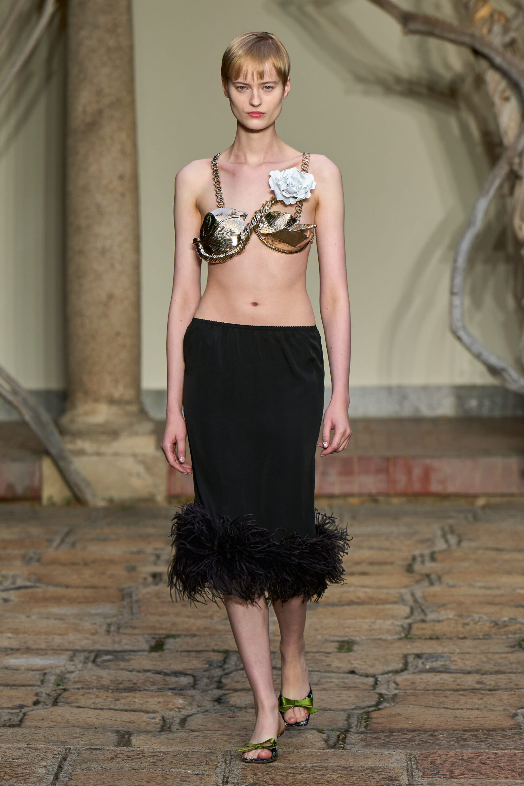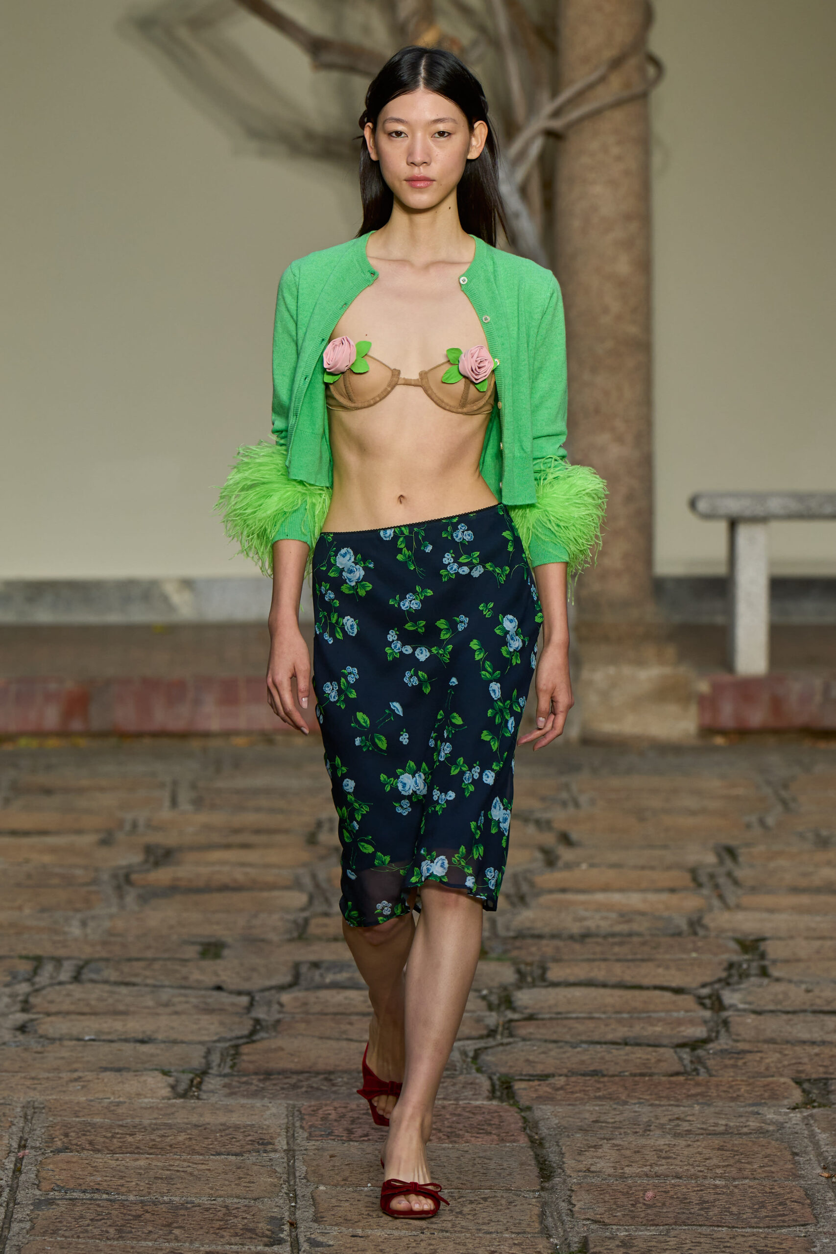 Come il pois è indagato nella sua accezione di oggetto, anche il fiore si evolve da print come firma di Vivetta a creazioni tridimensionali in tessuto. E quindi si esprime nello spazio avvinghiandosi al corpo, adornando gli scolli, chiudendo gli spacchi. Un ramage stringe appena il tulle increspato in giochi di trasparenze.