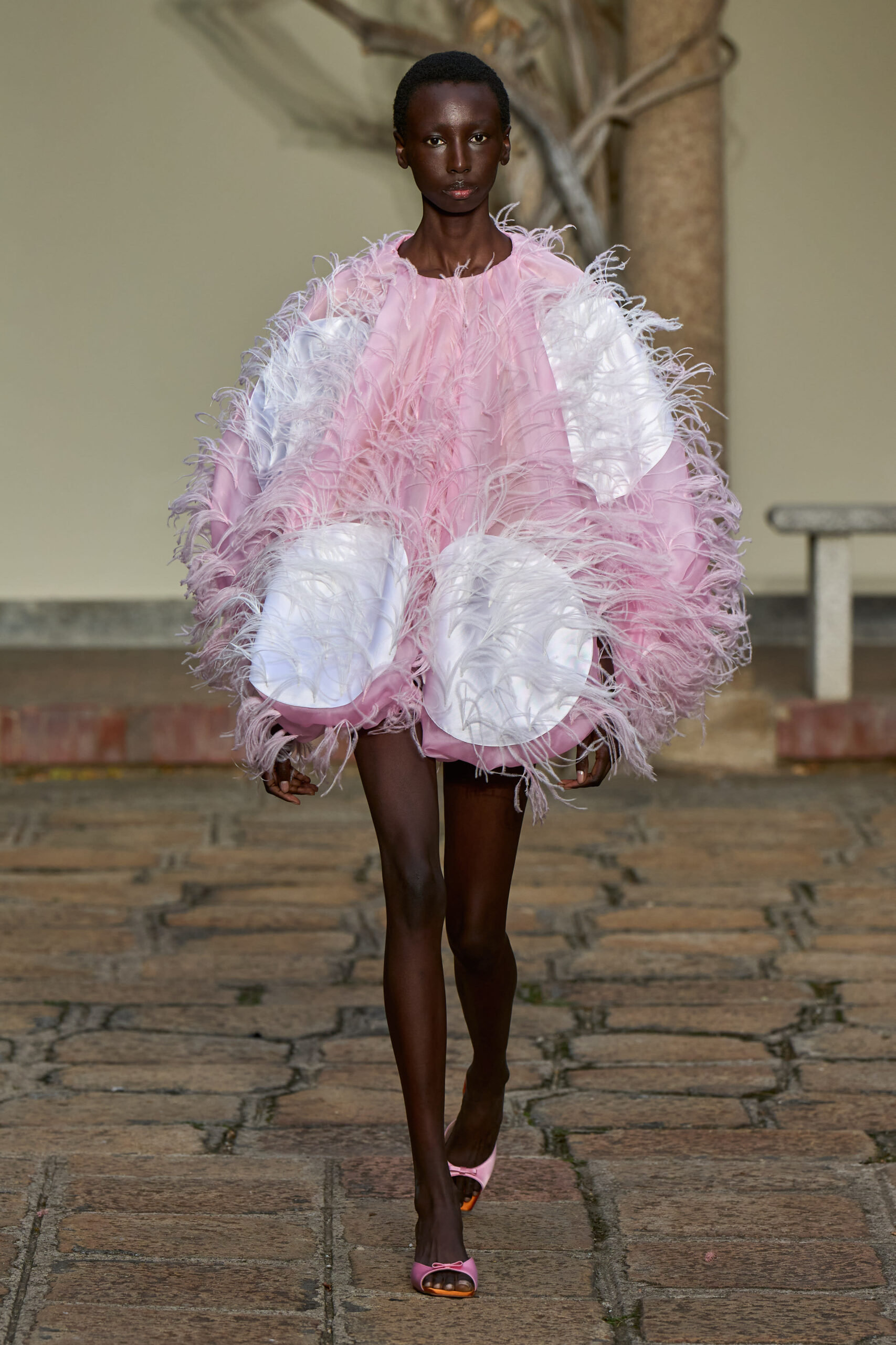 La collezione riflette sulla perfetta tondezza del pallino, che diventa micro e macro, stampa e ricamo. Il pois si aggiunge come inserto a contrasto su un abito in organdis di seta ricoperto di piume cucite a mano. Si sottrae nei cut-out, nelle aperture del denim traforato e incrostato di Swarovski. Si sublima in forma nella silhouette sferica di un ball dress. Fino a modellare gli oblò di scollature trattenute da lunghi gambi intrecciati, pronti a sbocciare in corolle di petali.