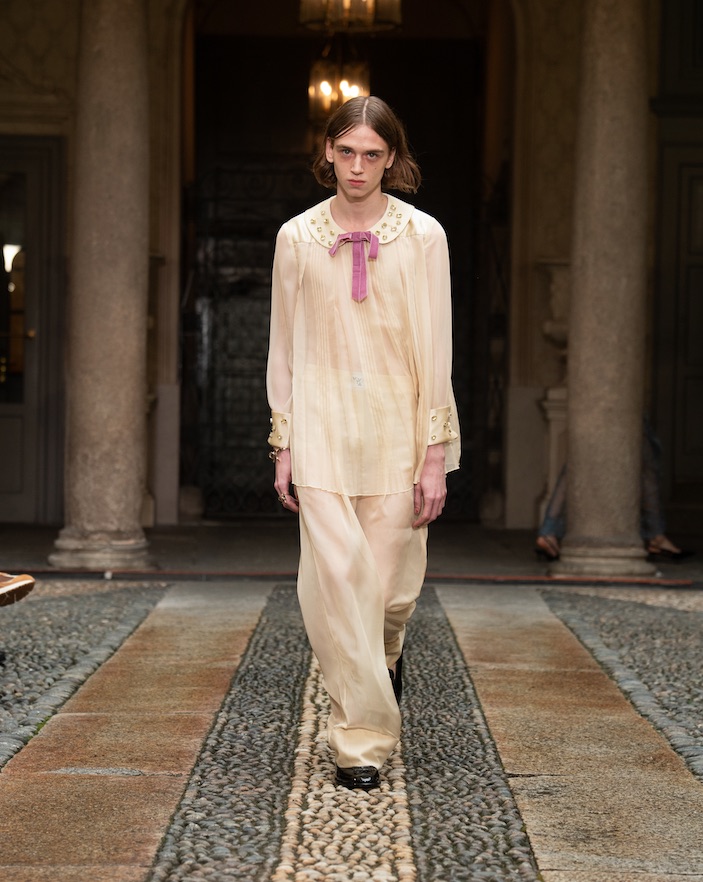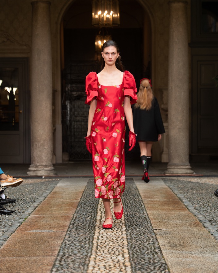 Una rosa è una rosa è una rosa. L’idea è nella tautologia vestimentaria come ripetizione ipnotica della rosa che Vivetta trasforma in diafora e mentre ripete il fiore come oggetto, ne amplia il significato. Quando sfilano boccioli selvatici da herbarium e ramage come ricami, a ogni nuova rosa compare l’idea che il senso del discorso si faccia più grande, misterioso.
