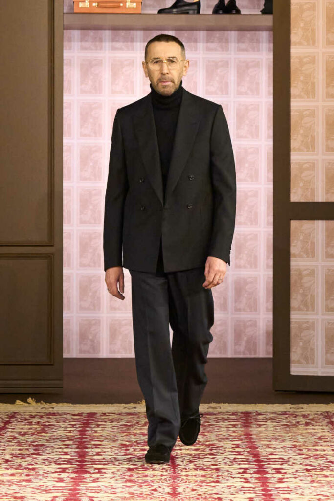La silhouette è lunga e morbida, l’attitudine dégagé. Cappotti e giacche si allungano e si ampliano, con spalle squadrate; i pantaloni hanno volumi pieni che scendono da una vita alta e definita. Il doppiopetto, simbolo di formalità, diventa giocoso e trasformabile, con nuove soluzioni di abbottonatura che permettono diverse modalità di indosso. Ricorre l’idea della molteplicità: blazer con doppio revers, blouson con doppi colli, capi pensati per essere interpretati.