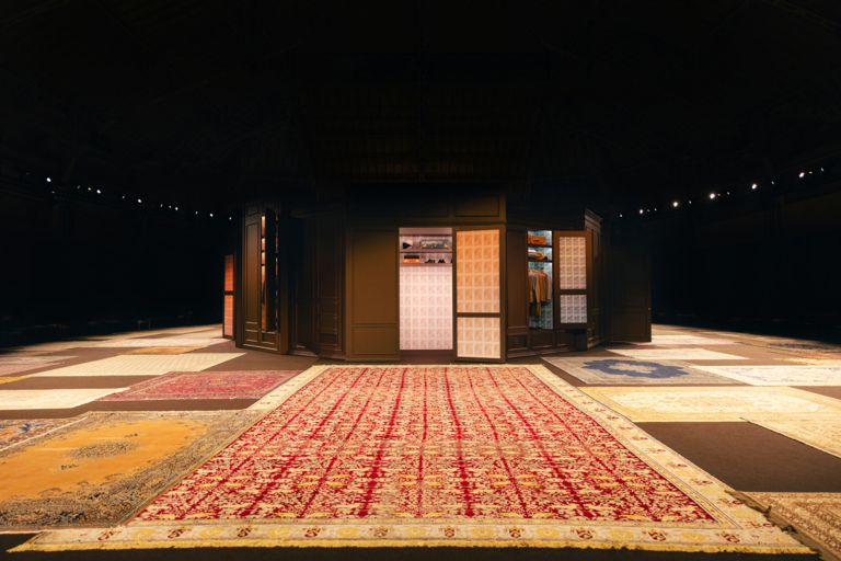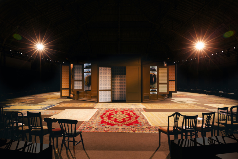 I confini tra categorie si dissolvono: motivi sartoriali diventano jacquard su camicie in seta lavata, l’anorak ridefinisce il blouson, le polo si fanno più strutturate. Overshirt fluide, bomber in shearling o maglia, pelle trapuntata, dettagli grafici e accessori essenziali – pantofole, mocassini, cappelli da pioggia in pelle, borse destrutturate – completano un guardaroba coerente e vissuto.