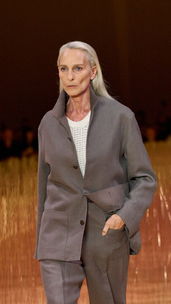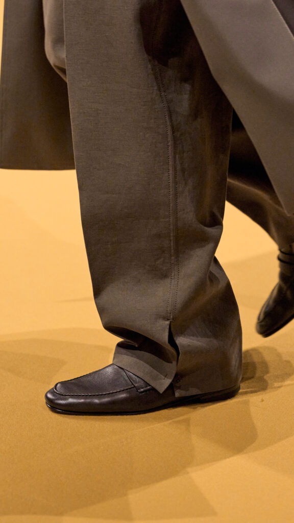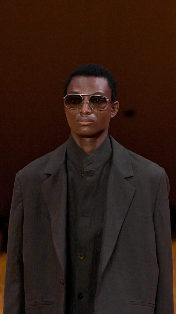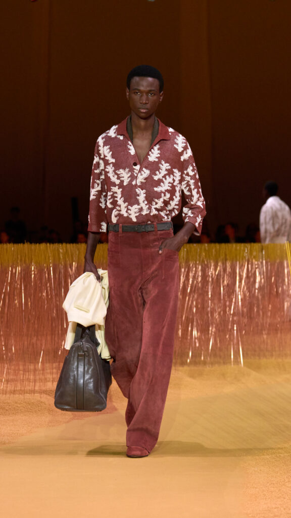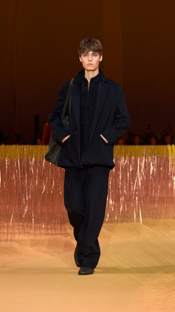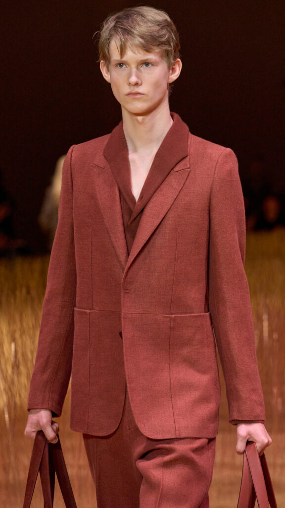 Mads Mikkelsen ha chiuso il Fashion Show indossando l’ultima iterazione della giacca “Il Conte”, in pelle di vitello color terracotta intenso. La nuova icona è abbinata a una maglia jacquard marrone cioccolato e a un pantalone sartoriale a gamba larga con cinque tasche. Per completare il look, indossa il nuovo mocassino il “Mocassin” e le borse in pelle nella stessa pelle di vitello terracotta profonda de “Il Conte”.