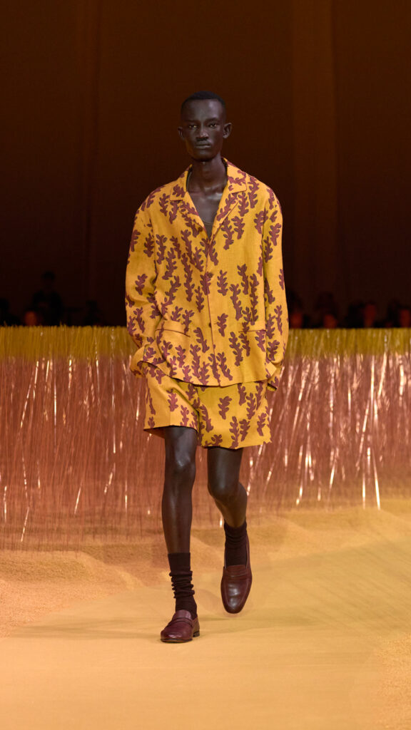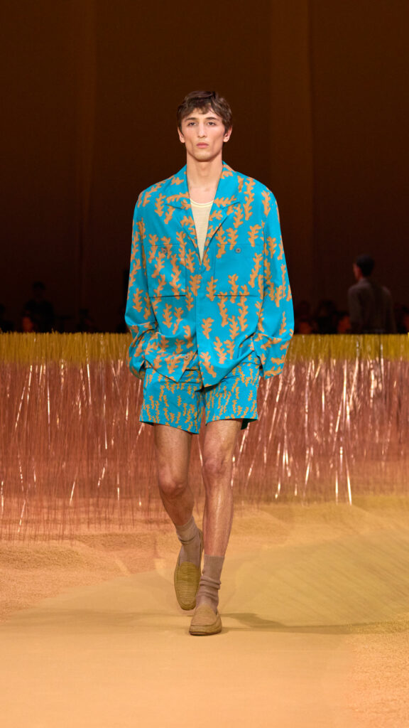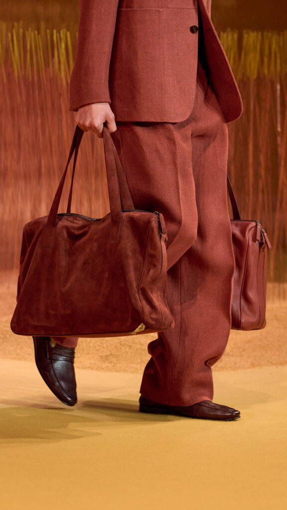 La silhouette è morbida e disinvolta, il corpo è chiaramente sentito e perfino messo a nudo da pantaloncini molto corti. Soprabiti e giacche hanno volumi avvolgenti, mentre i blazer allungati disegnano una linea slanciata. Colletti senza notch caratterizzano le camicie in maglia e le overshirt sartoriali. L’iconica giacca “Il Conte” è presentata in diverse versioni tra cui capispalla, pelle e giacche fino al modello senza maniche, inteso come gilet. Su pantaloni ampi, il posizionamento delle tasche suggerisce una varietà di posture e gesti, consentendo a chi li indossa di farli propri. T-shirt sartoriali e maglieria in lino sono pensati come capispalla. Polo in rete o stampate, indossate con pantaloncini abbinati, aggiungono un ulteriore livello di sensualità. Il nuovo mocassino il “Mocassin” – unica scarpa in sfilata – definisce l’attitudine estiva italiana, così come le stampe astratte dal sapore botanico ispirate all’ Born In Oasi Zegna e le morbide e capienti borse in suede. L’amalgama di tinte neutre – Bianco Zegna, giallo Sentiero, blu Sorgente, Sabbia, Faggio, Castoro – accese da note di Terracotta e Ortensia e accentate di Nero Opaco, conferisce una dimensione cromatica alle texture: lino – dal quattro capi al mélange, dal canvas ai pesi ultraleggeri: cotone/lino, seta, seta tecnica, doppione di seta, cotone/seta, mohair/seta, Oasi cashmere, pelle SECONDSKIN e nabuk per gli accessori.