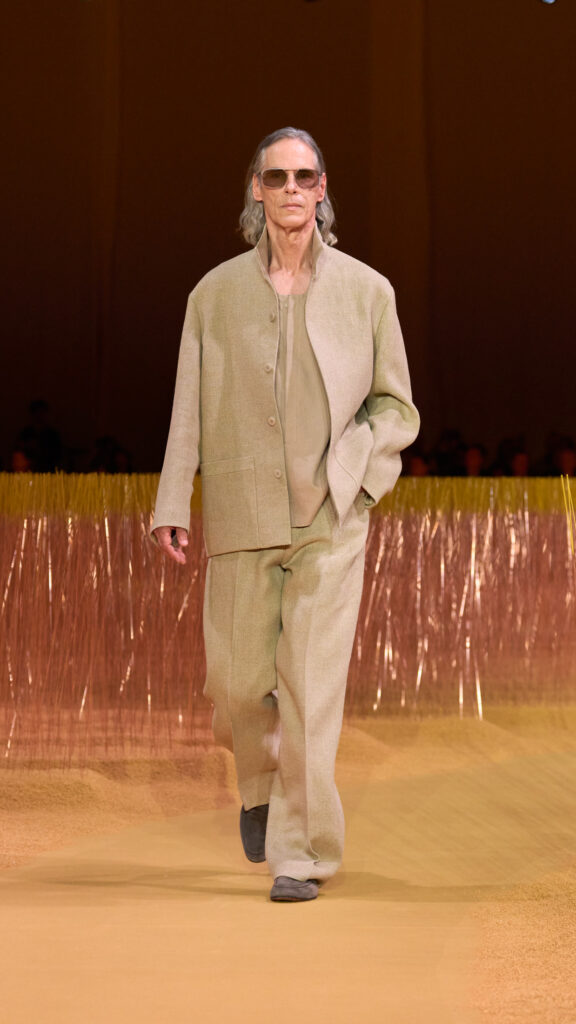 In natura non esistono due cose perfettamente uguali: la posizione specifica e l’insieme delle condizioni rendono ciascuno e ogni cosa un essere singolare, un’entità individuale. La sfilata Zegna si basa su questo concetto. Un edificio vuoto, uno spazio industriale quanto mai lontano dalla vivacità della natura ma, tra le pareti bianche, ecco un’improvvisa fioritura di piante di lino che hanno invaso il pavimento, disegnando una cortina attorno alla passerella, filtrando la luce, riportando vita in un luogo senza vita. A ben guardare, però, i fili di lino non sono vegetali. Sono infatti metallici, verniciati in una tonalità vivace di giallo Sentiero, vibranti come se fossero en plein air. E’ qui che l’uomo e la natura si incontrano, intrecciando e sovrapponendo i loro mondi, imperfetti nella loro esecuzione, diversi per la loro identità. Questo è ciò che in definitiva promuove questo nuovo capitolo di ZEGNA: la pluralità come somma di differenze; l’individualità che emerge anche quando i capi indossati sembrano apparentemente identici. Il messaggio è: Noi, nell’Oasi Del Lino.