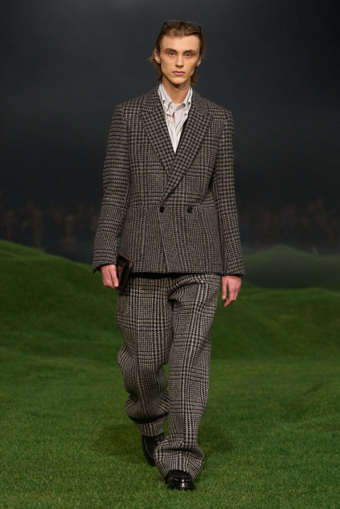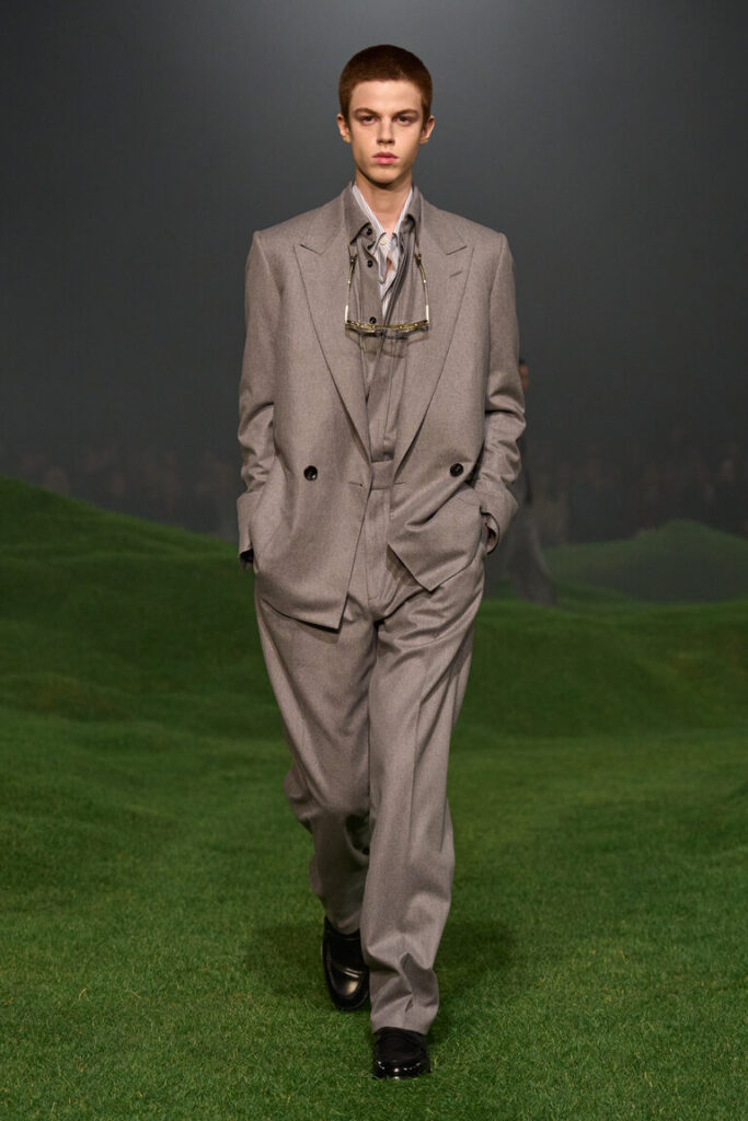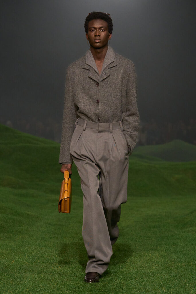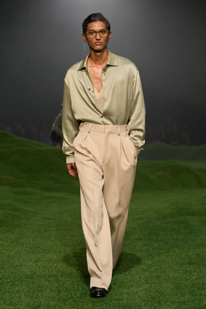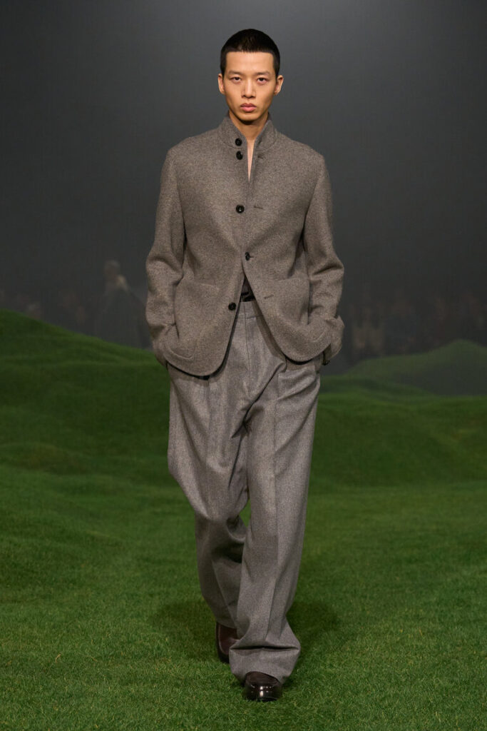 Nel 1963, Ermenegildo Zegna, il fondatore, istituì i Wool Trophy Awards in Australia per supportare gli allevatori nella loro ricerca della lana più sottile al mondo. Dal vello extra fine, ogni anno viene filata una fibra straordinaria, con la quale vengono tessute le stoffe più morbide e raffinate. Vellus Aureum è, oggi, il nome di questo gioiello nella corona delle lane ZEGNA. Si riferisce all’impresa mitica di Giasone e degli Argonauti: la ricerca del Vello d’oro, rappresentato come ariete alato. Per ZEGNA, Vellus Aureum rappresenta la ricerca dello straordinario: un testimone che continua a essere passato di generazione in generazione, come etica imprenditoriale e come sigla di stile. Ad oggi, il record mondiale Vellus Aureum per la singola fibra di lana è stato raggiunto nel 2023 con una finezza di 9,4 micron. La nuova sfilata e la nuova collezione sono un omaggio a questo mindset. Le colline ricoperte di erba verdissima su cui si muovono i modelli richiamano il verde e la scala dei paesaggi australiani, le loro linee sinuose simbolo di continuità tra uomo e natura, nonché di connessione tra mondi e mestieri geograficamente distanti, eppure collegati. Questo è ciò che il nuovo capitolo del reset di ZEGNA in ultima analisi promuove: un diverso sguardo alle radici, rispettoso nello spirito e libero nell’interpretazione, con un tocco inconfondibilmente italiano.