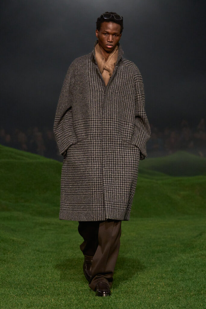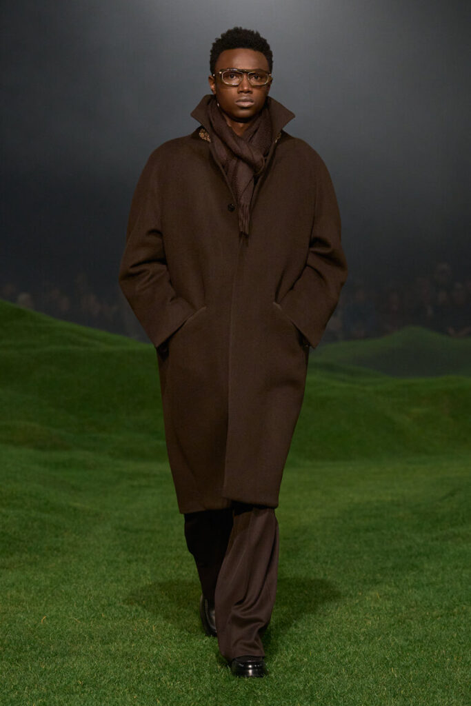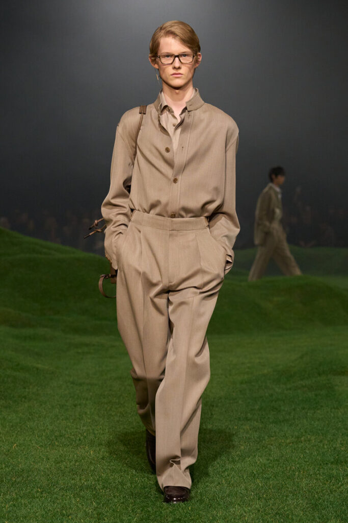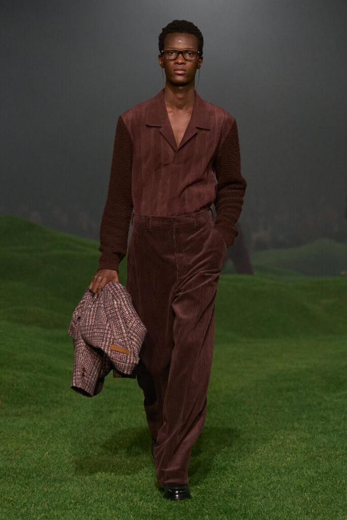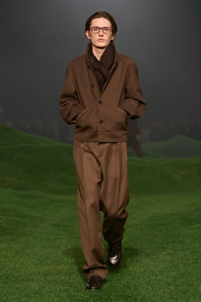 La silhouette è decostruita, i volumi sono avvolgenti, le proporzioni sono ripensate, con macro- pattern e macro-motivi donegal, selezionati dalla biblioteca della tradizione, che sottolineano il gioco delle proporzioni. Blazer destrutturati con chiusure basse a due bottoni; cappotti oversize con colli in pelliccia di cashmere che arrivano fino al ginocchio; i blouson sono ampi, con revers o colletti alti ed elastico in vita. La maglieria è la protagonista della stagione. I dettagli suggeriscono gesti: scollature a V profonde lasciano intravedere due camicie ordinatamente sovrapposte l’una all’altra; le tasche sono tagliate in diagonale e basse, per infilarci le mani; maglioni e cardigan spessi sono infilati dentro pantaloni a vita alta. La camicia dal collo morbido è ora realizzata in maglia; il cashmere e il velluto a coste di cotone sono il tessuto di abiti robusti ma morbidi. Gli abiti di Oxford lavato sembrano avere vissuto un’altra vita. L’iconica giacca Il Conte continua a evolversi ed è presentata in montone, come gilet e in una versione in jersey Oasi Cashmere. Mocassini con suole spesse, occhiali dal disegno preciso, morbide borse a tracolla evidenziano l’atteggiamento noncurante. La palette è un mix tonale di note neutre di fossile, ginepro, fogliame scuro, serra, castoro, rosso Gattinara e falesia con nuance di Sessera, arnica, giglio montano, terracotta e accenti di nero opaco. Le texture sono tattili, dense, soft: lana cashmere, velluto a coste di cotone cashmere, cover di lana mohair, flanella di lana, Oasi Cashmere.
