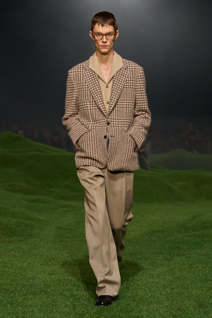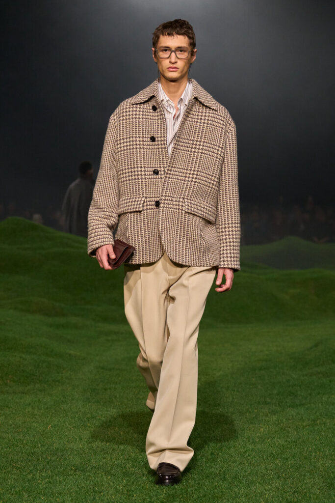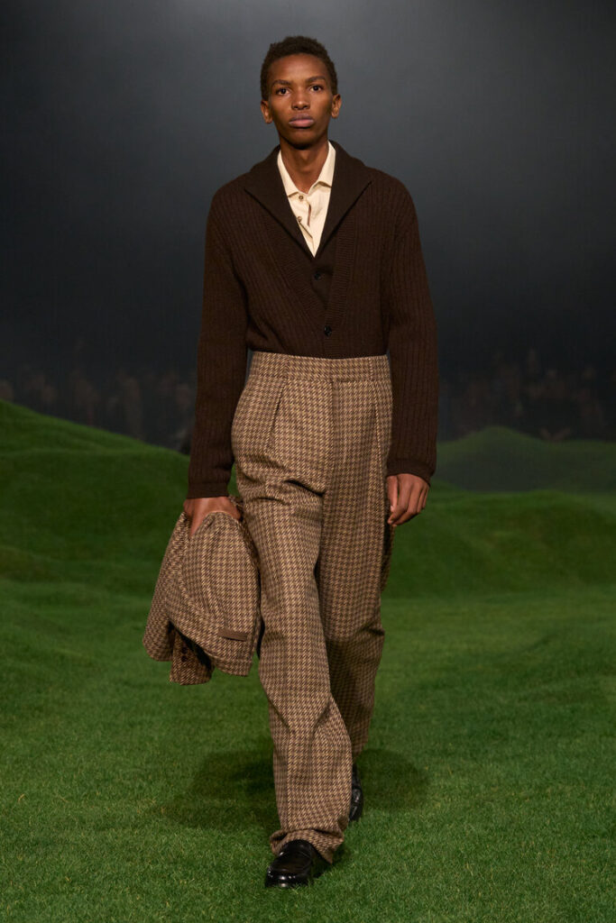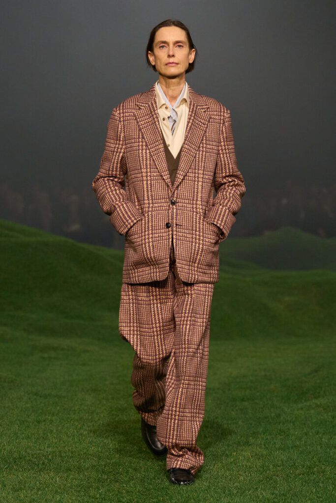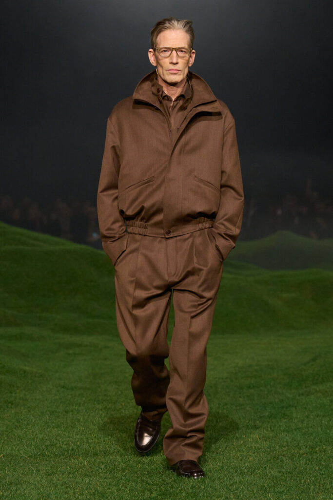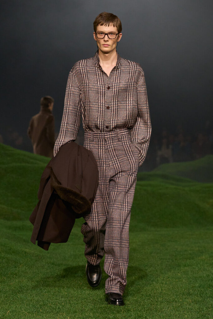 La silhouette è decostruita, i volumi sono avvolgenti, le proporzioni sono ripensate, con macro- pattern e macro-motivi donegal, selezionati dalla biblioteca della tradizione, che sottolineano il gioco delle proporzioni. Blazer destrutturati con chiusure basse a due bottoni; cappotti oversize con colli in pelliccia di cashmere che arrivano fino al ginocchio; i blouson sono ampi, con revers o colletti alti ed elastico in vita. La maglieria è la protagonista della stagione. I dettagli suggeriscono gesti: scollature a V profonde lasciano intravedere due camicie ordinatamente sovrapposte l’una all’altra; le tasche sono tagliate in diagonale e basse, per infilarci le mani; maglioni e cardigan spessi sono infilati dentro pantaloni a vita alta. La camicia dal collo morbido è ora realizzata in maglia; il cashmere e il velluto a coste di cotone sono il tessuto di abiti robusti ma morbidi. Gli abiti di Oxford lavato sembrano avere vissuto un’altra vita. L’iconica giacca Il Conte continua a evolversi ed è presentata in montone, come gilet e in una versione in jersey Oasi Cashmere. Mocassini con suole spesse, occhiali dal disegno preciso, morbide borse a tracolla evidenziano l’atteggiamento noncurante. La palette è un mix tonale di note neutre di fossile, ginepro, fogliame scuro, serra, castoro, rosso Gattinara e falesia con nuance di Sessera, arnica, giglio montano, terracotta e accenti di nero opaco. Le texture sono tattili, dense, soft: lana cashmere, velluto a coste di cotone cashmere, cover di lana mohair, flanella di lana, Oasi Cashmere.